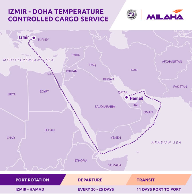 Geçtiğimiz haftalarda Milaha, Katar ile Türkiye arasında resmi olarak planlanmamış iki soğuk hava depolu gemi seferi düzenlemişti. Şirket sonra bu seferleri düzenli bir hizmete dönüştürme kararı aldı ve bu amaçla 20 ila 25 gün aralıklarla Hamad Limanı ile İzmir Limanı arasında 11 günlük transit süresine sahip bir sefer düzenleyeceğini duyurdu.