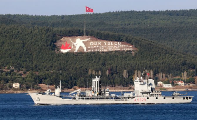 Kilitbahir Köyü Dağı’nda bulunan 'Dur Yolcu' yazısı ile Kilitbahir Kalesi önünden geçen savaş gemileri, Ege Denizi'ne doğru yol aldı. NATO gemilerine Türk savaş gemisi M266 borda numaralı TCG Akasar da eşlik etti.