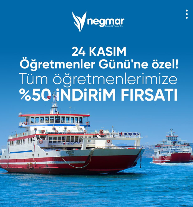 Negmar Feribot İşletmeleri, öğretmenlerimize minnettarlığını göstermek amacıyla 24 Kasım Öğretmenler Günü'nüne özel bir kampanya uyguluyor: Eskihisar-Yalova arasında feribot bilet alımlarında %50 indirim fırsatı sunuyor.