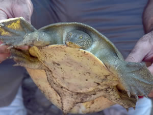 Atatürk Barajı Gölpınar bölgesinde ağ atan balıkçının ağına balıklarla birlikte bir kaplumbağa takıldı. Bu güne kadar gördüğü kaplumbağalardan farklı bir kaplumbağa olduğunu fark eden balıkçı Yılmaz Toprak, Adıyaman Üniversitesi Fen Edebiyat Fakültesi Biyoloji Bölümü Zooloji Anabilim Dalı öğretim üyesi Doç. Dr. Mehmet Zülfü Yıldız’a bilgi verdi.