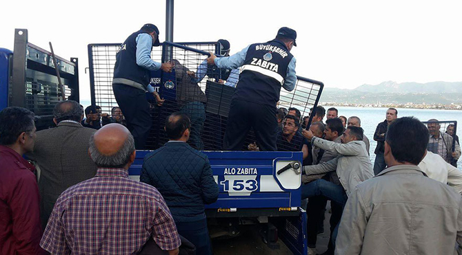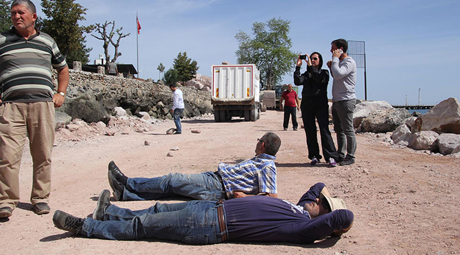 Alan demir bariyerlerle çevrilirken, polis eşliğinde taş kamyonları ve iş makineleri de çalışmaya başladı. Denize dolgu çalışmaları sürerken, bazı vatandaşlar da bariyerlerin arkasında toplanmaya başladı.