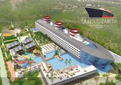 Türk turizm yatırımcısının esinlendiği Queen Elizabeth 2 gemisi, dünyanın en lüks gemisi olarak biliniyor. Geçtiğimiz yıl Türkiye’ye 3 kez gelen, 32 metre eni, 270 metre boyu olan, 11 katlı, 75 bin 327 grosstonluk gemide, 42’si kral dairesi olmak üzere 234 oda bulunuyor. 5 restoran, 3 yüzme havuzu, alışveriş merkezi, sinema, spor, balo salonları da bulunan transatlantik, 1969 yapımı... Her yıl ocak ayında 3 ay süren dünya turuna çıkan dev geminin koridorları 2. Elizabeth’in resimleri ile kraliyet ailesine ait antikalarla süslü...