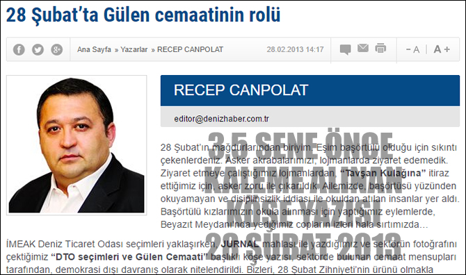 Deniz Haber Ajansı Genel Yayın Yönetmeni Recep Canpolat'ın 28 Şubat Post Modern Darbesinin 17. yılında kaleme aldığı "28 Şubat’ta Gülen cemaatinin rolü" başlıklı yazısında, Fethullah Gülen ve Cemaatin, 28 Şubat 1997 yılında darbecilere alkış tuttuğu ve cuntacıların postalına selam durduğu belirtilerek, Fethullah Gülen ve cemaatinin, kirli geçmişlerini temizlemesi gerektiği ifade edilmişti.