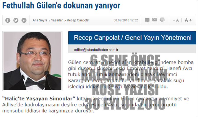 Recep CANPOLAT imzasıyla 30 Eylül 2010 tarihinde "Fethullah Gülen'e dokunan yanıyor" başlığıyla kaleme aldığı köşe yazısında, Eskişehir Emniyet Müdürü Hanefi Avcı'ya karşı, devlet içinde bulunan cemaat kadroları tarafından kumpas kurulduğu ifade edilirken, Hanefi Avcı'nın cemaate dokunmanın bedelini cezaevine girerek ödediği kaydedilmişti.