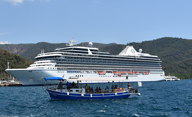 16 katlı, 238 metre uzunluğunda, 32 metre genişliğinde ve 2 bin kişi konaklama kapasiteli olan Marshall Adası bayraklı Riviera isimli yolcu gemisi, Marmaris Gümrüklü Limanı'na yanaştı.