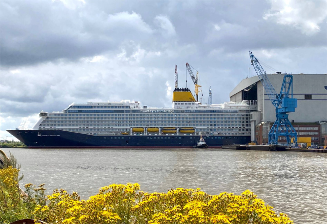 Almanya Papenburg kentindeki Meyer Werft tersanesi, dünyanın en yeni kruvaziyer gemisini suya indirdi! 58.250 GRT'luk Spirit of Adventure, İngiltere'nin Saga Cruises şirketi için inşa edildi.