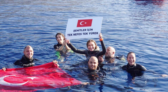 Sporcu, zaferini kutladığı ekip arkadaşlarıyla denizde Türk bayrağı ve üzerinde "Şehitlerimiz için tek nefes, tek yürek" yazan bir pankart açtı.