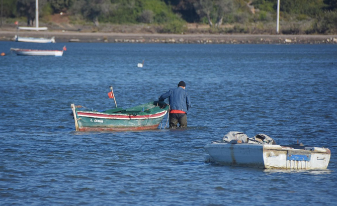 Seferihisar Sığacık’ta sabah saatlerinde gel-git başladığı görülürken suyun dibinde bulunan otlar ve yosunlar suyun yüzeyine çıktı.