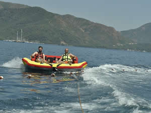 Tatil için İstanbul'dan Marmaris'e gelen ve su sporları ile tatilin keyfini çıkaran Özcan Kırdemir kardeşi ile bindiği şişme minder ile hız teknesinin arkasında 15 dakika boyunca hem eğlendi hem de serinledi. Pandemi doalyısıyla uygulanan kuralların eksiksiz riayet edildiğini ve güvenle suda eğlendiklerini belirten Kırdemir, "Kuralları uyarak herkes tatilini ve sosyal yaşantısını devam edebilir" diye konuştu.