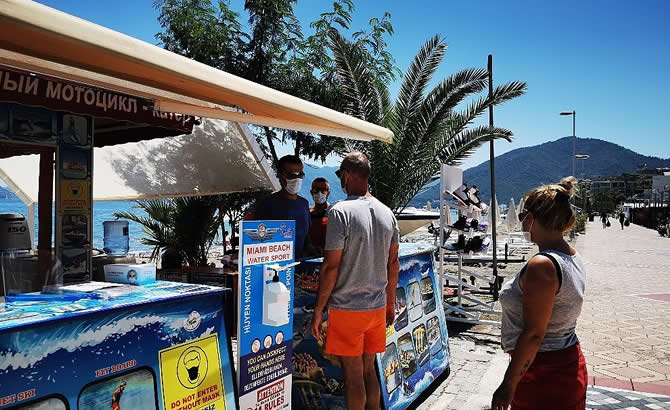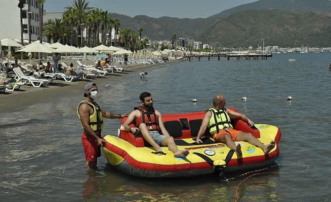Tüm sektörlerde olduğu gibi turizm sektörü de kendini normalleşme sürecine göre yeniledi. Su sporları aktivite merkezleri de 14 hijyen ve sosyal mesafe kuralına göre hazırlanarak müşterilerinin tatillerinde güzel anılar bırakması için çalışıyor. Marmaris'te bir su sporları merkezinin yöneticisi İhsan Özbey, işletmelerini pandemi kurallarına uygun şekilde hazırladıklarını belirterek "Girişte ateş ölçüyoruz, ateşi normal seviyede olanları alıyoruz. Misafirlerimiz dezenfektan ile ellerini temizleyip maske takarak içeri giriyor. Sosyal mesafe kurallarına uygun bir şekilde aktiviteleri gerçekleştiriyoruz. Özellikle aile değiller ise asla yan yana almıyoruz. Yeleklerimiz her kullanımdan sonra dezenfekte ediliyor" diyerek Sağlık Bakanlığı'nın açıkladığı 14 kurala harfiyyen riayet ettiklerini söyledi.