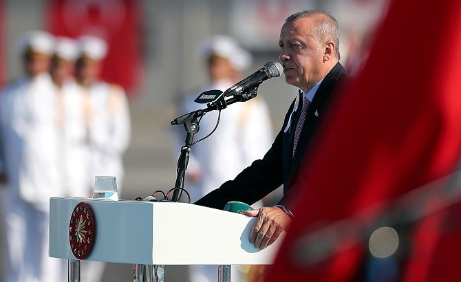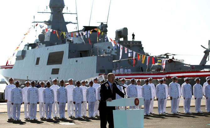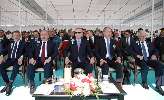 "Son dönemde dünya ve özellikle Akdeniz'de yaşanan hadiseler, bize her alanda olduğu gibi denizlerde de çok daha güçlü olmamız gerektiğini işaret ediyor. Bu sebeple karada ve havada devreye aldığımız nice savunma ve taarruz sistemlerimiz gibi MİLGEM gemilerimizi de kararlılıkla inşa ediyor, denizlere uğurluyoruz. Türkiye bugün dünyada bir savaş gemisini milli imkanlarıyla tasarlayan, inşa eden ve idamesini gerçekleştirebilen 10 ülkelerden biri olmuştur. Bu kapsamda hepimiz, ürettiğimiz Heybeliada'yı 2011'de, Büyükada'yı 2013'te, Burgazada'yı da 2016'da denize indirmiştik. MİLGEM Projesi'nde yıllar içinde edinilen tecrübeyle, yerlilik oranını yüzde 70 seviyesine kadar yükselttik ve böylece onu denize indiriyoruz."