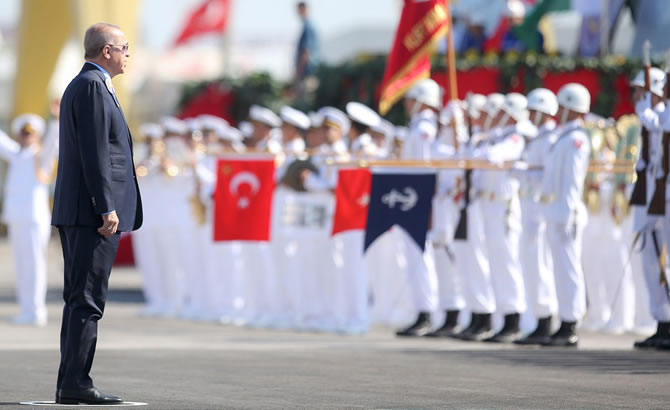 Cumhurbaşkanı Erdoğan resmi törenle karşılanırken, Erdoğan askerleri "Merhaba Bahriyeli. Nasılsınız?" diyerek selamladı.