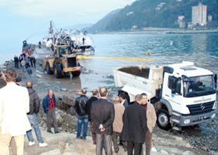 Rize'nin Gündoğdu Limanı’na yanaşmaya çalışırken kayalıklara çarparak yan yatan balıkçı teknesini kurtarma çalışmaları devam ediyor. Kayalıklar arasından çıkarılamayan tekne için yol yapımına başlandı. Rize ve Gündoğdu Belediyeleri’ne ait kamyonlarla deniz doldurularak tekne kurtarılmaya çalışılacak. Belediye Başkanı Halil Bakırcı, 300 kamyon taş döküp, yol yaparak tekneye ulaşmaya çalışıyoruz” dedi.