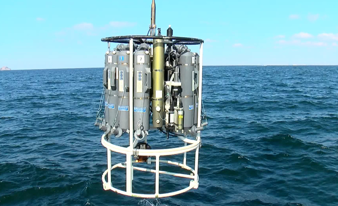 Araştırmacı Dr. İbrahim Tan, CTD cihazı hakkında bilgi vererek "Çoklu örnekleyicisi düzeneği olan bir sensor grubu var. Bu sensorlar sıcaklık, tuzluluk, iletkenlik, çözünmüş oksijen gibi parametreleri derinliğe bağlı ölçüyor. Yukarıda fizik odasında belirlenen derinliklerden örnekler alınmasını sağlıyor. Etrafında bulunan 12 tane şişe var. Cihaz istendiği derinlikte durdurulabiliyor duran yerden örnek alınması sağlanıyor" dedi.