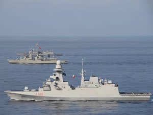 Türk Deniz Görev Grubu'nda görevli TCG Gaziantep fırkateyni, İtalyan ITS Carabiniere ve Yunan HS Aegeon fırkateynleriyle orta Akdeniz'de deniz eğitimleri gerçekleştirdi.