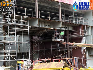 Türk Deniz Kuvvetleri'nin harekat kabiliyetini artıracak, merakla beklenen Hücum Gemisi Anadolu'nun biten bloklarının montajına başlanırken, birleştirilip havuza indirilen kısım görüntülendi.
