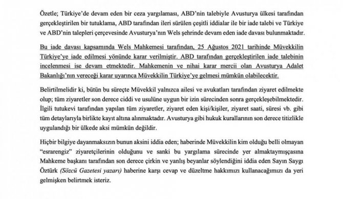 Dülger, "Mahkemenin ve nihai karar mercii olan Avusturya Adalet Bakanlığı'nın vereceği karar uyarınca müvekkilin Türkiye'ye gelmesi mümkün olabilecektir" dedi.