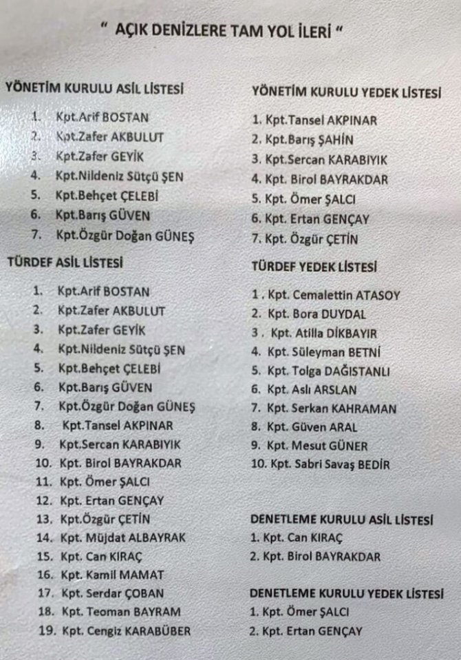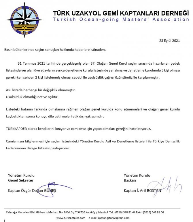 TÜRKKAPDER Yönetim Kurulu Başkanı Kaptan İ. Arif Bostan ve Genel Sekreter Kaptan Özgür Doğan Güneş imzasıyla yayınlanan açıklamada, “Basın bültenlerinde seçim sonuçları hakkında haberlere istinaden, 31 Temmuz 2021 tarihinde gerçekleşmiş olan 37. Olağan Genel Kurul seçim sırasında hazırlanan yedek listesinde yer alan üye adayların ayrıca denetleme kurulu listesinde yer almış ve denetleme kurulunda 3 kişi olması gerekirken sehven 2 kişi listelenmiş olması sebebi ile usülsüzlük çağrısı üzüntümüz ile karşılanmıştır. Asil listede herhangi bir değişiklik olmamıştır. Usülsüzlük olmadığı net ve açıktır. Listedeki hatanın farkında olmalarına rağmen olağan genel kurulda konu etmemeleri ve olağan genel kurulu kaybettikten sonra konuyu dile getirmeleri etik dışı yaklaşımdır. TÜRKKAPDER olarak kendilerini kınıyor ve camiamız için yapıcı olmaları gerektiğine inanıyoruz. Camiamızın bilgilenmesi için seçim listesindeki yönetim kurulu asil ve denetleme listeleri ile Türkiye Denizcilik Federasyonu delege listesini paylaşıyoruz” denilmişti.