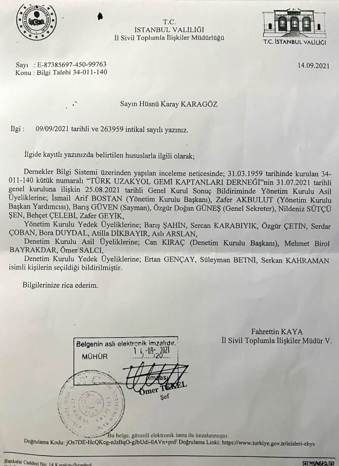 Kaptan Karagöz tarafından yapılan yazılı açıklamada, “Türk Uzakyol Gemi Kaptanları Derneğimi’zin yönetim kurulu ve denetleme kurulu asli ve yedek üyelerinin seçimine dair başlattığımız hukuki girişime ilişkin hakkımızda yayılan yanıltıcı ve asılsız bilgiler üzerine kamuoyumuzu aydınlatmak amacıyla bu bilgilendirmeyi yapma ihtiyacı doğmuştur. Türk Uzakyol Gemi Kaptanları Derneği’mizin 37. Genel Kurul toplantısı Uzak Yol Gemi Kaptanı meslektaşlarımızın katılımı 31.07.2021 tarihinde yapılmış ve blok liste halinde yönetim kurulu ve denetleme kurulu asli ve yedek üyelerinin seçimi oylanmıştır. Ancak İstanbul Valiliği İl Sivil Toplumla İlişkiler Müdürlüğü’nden (eski adı Dernekler masası) resmi olarak öğrendiğimiz üzere, dernek yönetim kurulu ve denetleme kurulu üyelerinin kaydedildiği Dernekler Bilgi Sistemi’ne (DERBİS) genel kurulda seçilmemiş kişiler, seçilmiş gibi bildirilmiştir. Müdürlük tarafından verilen cevabi yazıyı ayrıca açıklamamda bilginize sunarım” denilmişti.