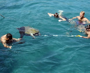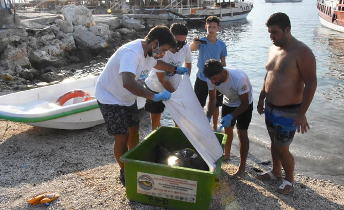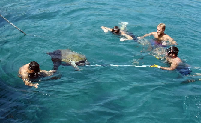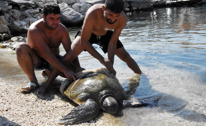Bir ağa bağlanan yaralı kaplumbağa, kıyıya yaklaştırıldı ancak ağı yırtarak, tekrar su altına kaçtı. Bu kez, tekrar denize giren grup, kaplumbağayı yeniden ağlarla bağladı. 2 kişi kaplumbağaya destek vererek, küçük bir tekneyle 3 saat süren uğraş sonunda kıyıya getirdi. Bu arada, Çevre ve Şehircilik Bakanlığı Doğa Koruma ve Milli Parklar Müdürlüğü’ne bağlı Muğla’daki Deniz Kaplumbağaları Araştırma Kurtarma ve Rehabilitasyon Merkezi'ne (DEKAMER) de haber verildi.