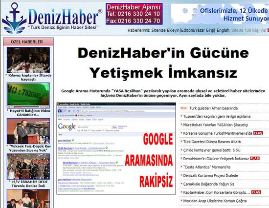 Okuyucu profilinde son iki ay içinde % yüz artış sağlayan www.denizhaber.net internet portalı, denizcilik sektörünün tek ve rakipsiz haber portalı olmayı sürdürüyor. Lider olmamızı hazmedemeyen ve kamuoyu tarafından Cahit İstikbal'in kontrolünde olduğu bilinen sözde haber siteleri yalan ve uydurma haberlerle okuyucu kitlelerini kandırmaya ve bitişlerini zamana yaymaya çalışması komiklikten öte gitmiyor.