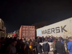 İşçi sendikalarının çağrısıyla toplanan işçiler, mühimmat dolu konteynerin gemiye yüklenmesine izin vermedi.